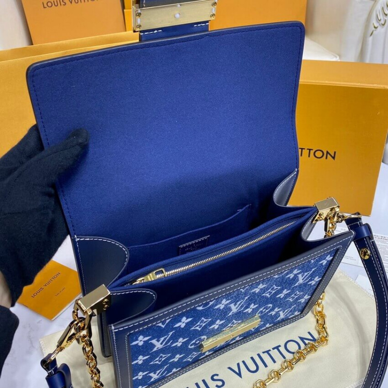 A bolsa Dauphine MM, com suas linhas vintage, é formada a partir de têxteis jacquard desbotados com um padrão de monograma e acabado em acabamentos de pele de bezerro azul marinho. Detalhes sofisticados, como a trava do círculo de LV de cor dourada, adicione o charme enquanto a alça removível e dois compartimentos internos trazem praticidade. Br]]Denim Jacquard Têxtil Faixa
