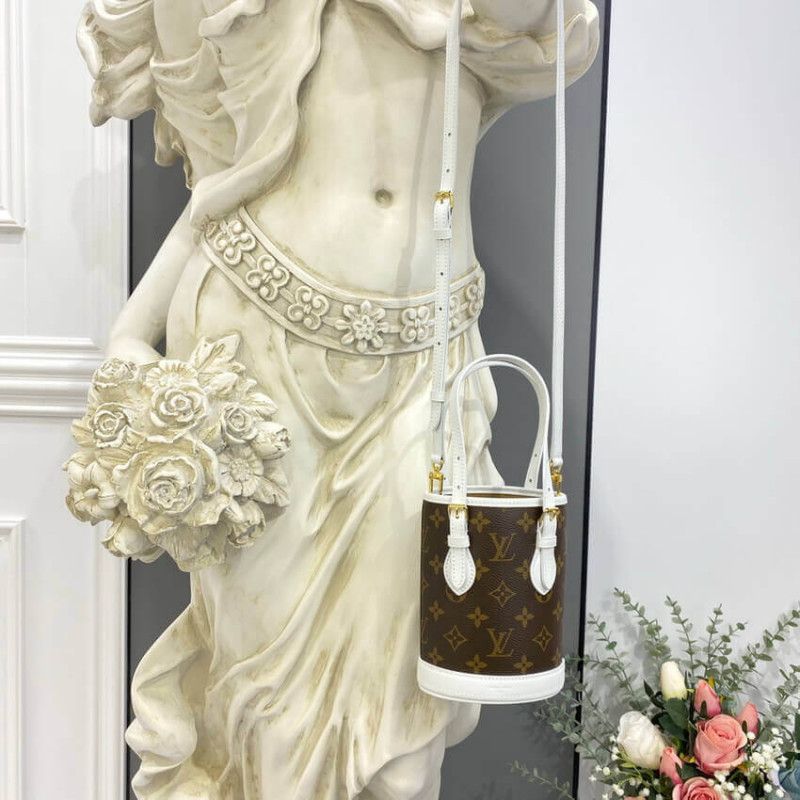 O Nano Bucket, na icônica tela de monograma de Louis Vuitton, faz parte da coleção de partidas do LV, que presta homenagem aos torneios de tênis mais famosos do mundo. Esta bolsa de caçamba em miniatura possui duas alças ajustáveis e uma alça de ombro removível e ajustável em couro branco, inspirado nas linhas em uma quadra de tênis. Dentro da bolsa, uma bolsa removível em uma corrente de tons de ouro é perfeita para objetos de valor. ] Hardware de cor dourada