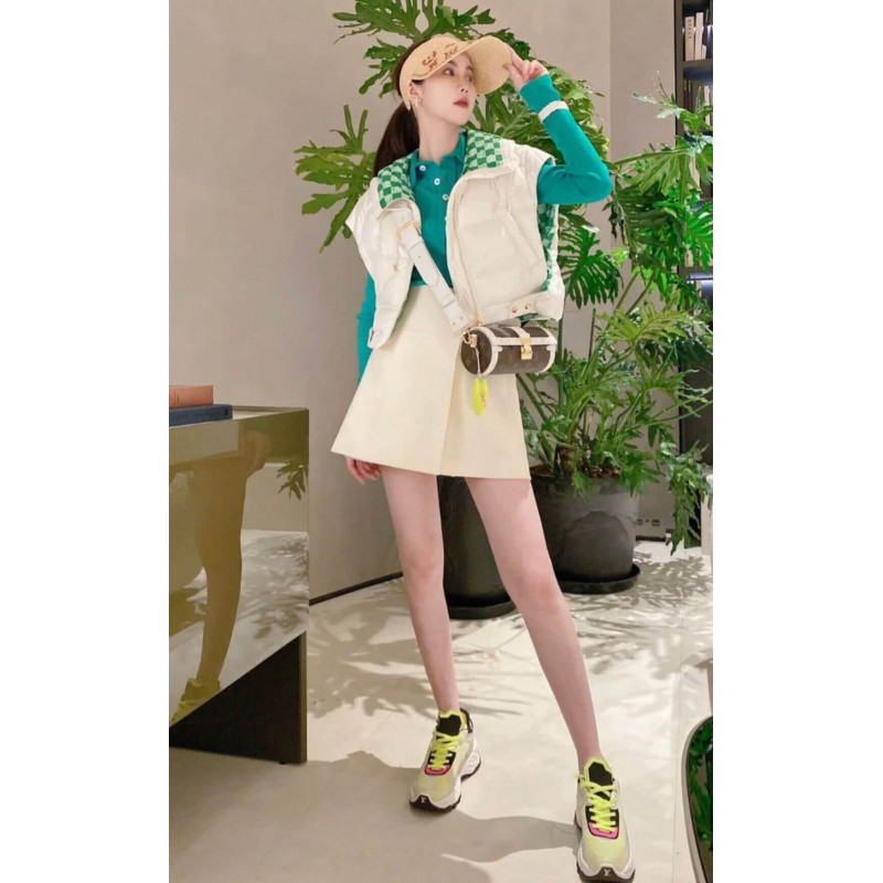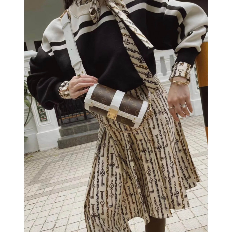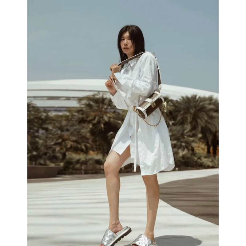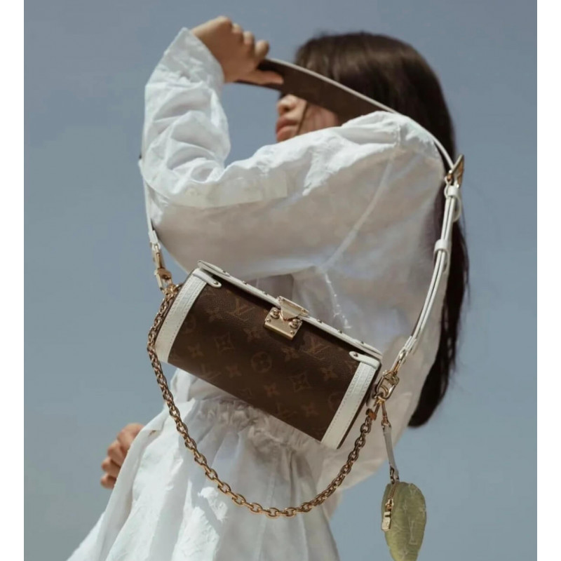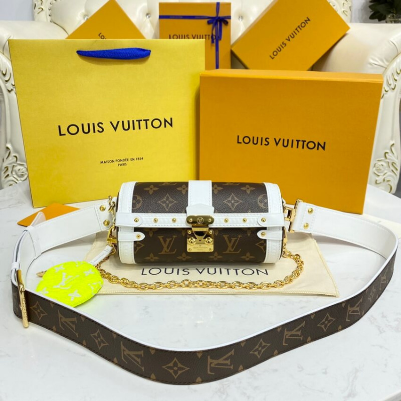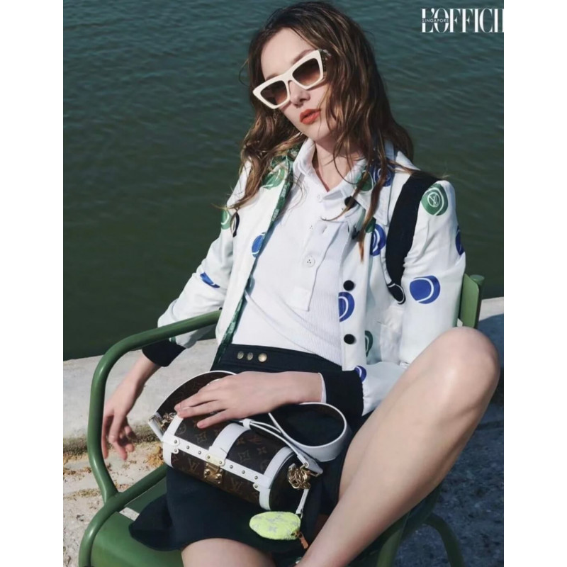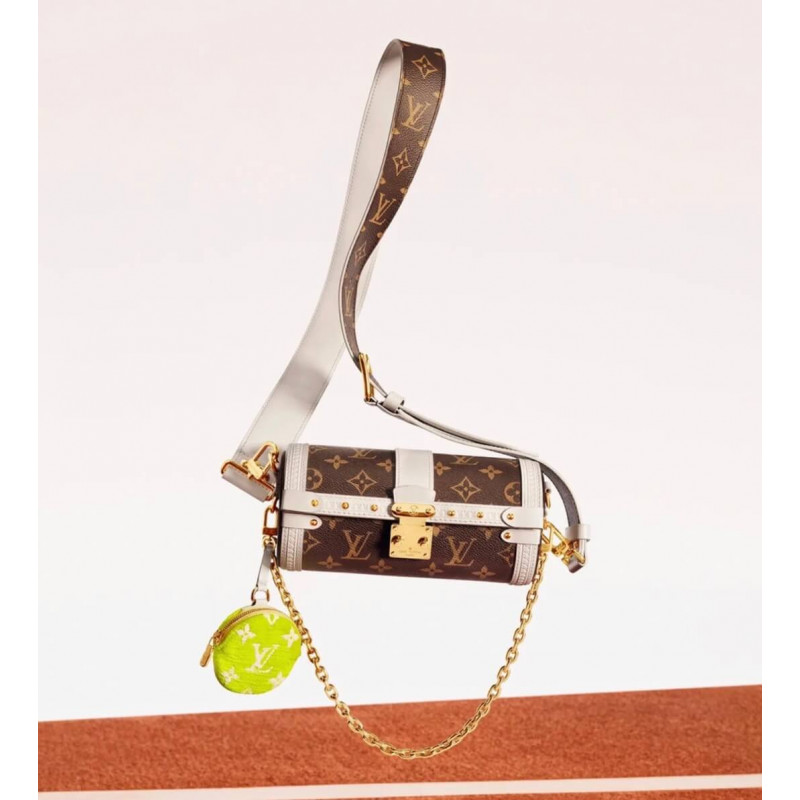Uma visão esportiva do colorway do monograma, a bolsa Papillon, combina tela com acabamentos de couro branco. A forma da baguete é inspirada em uma bolsa dos arquivos da casa e apresenta o S-bock e os rebites encontrados nos troncos históricos de Louis Vuitton. A bolsa de moedas redonda em redonda na bola de tênis assina a bolsa como parte da coleção de cápsulas de correspondência do LV. TRIM