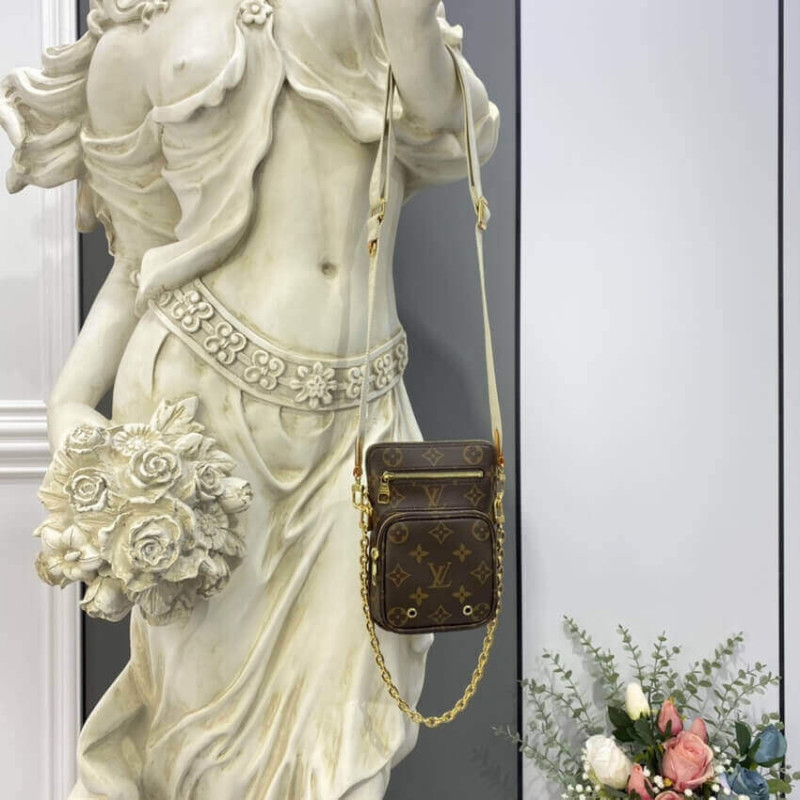 A manga telefônica do monograma é uma bolsa multitarefa para toda a moda. Ele se adapta a diferentes tamanhos de smartphone e também pode conter essenciais, como cartões, dinheiro ou chaves em seus bolsos seguros e com zíper. Tanto a cinta de tela ajustável quanto a corrente de metal são removíveis e oferecem várias opções de transporte.