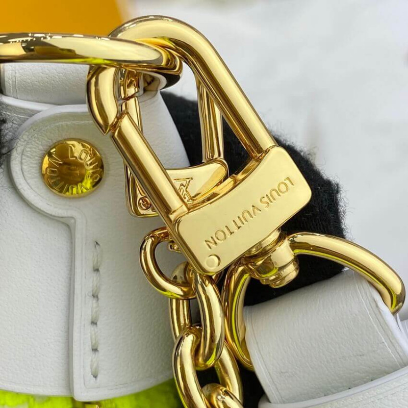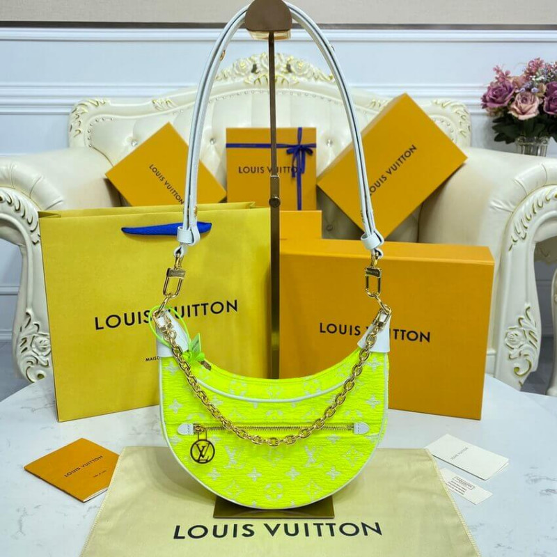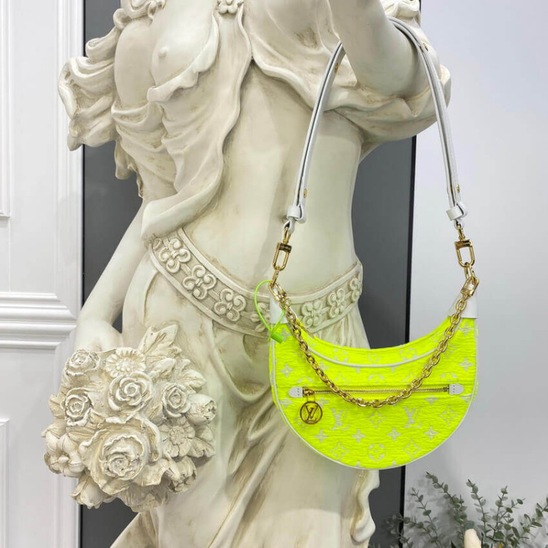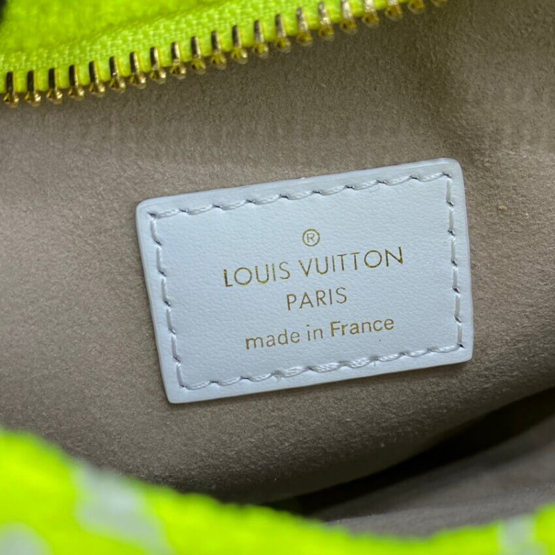 A bolsa de baguete de meia-lua é formada a partir do monograma Jacquard Velvet em uma cor amarela brilhante, lembrando o icônico amarelo das bolas de tênis. O veludo Jacquard é um material 100% sustentável feito de fios reciclados. -Gold-Color Hardware