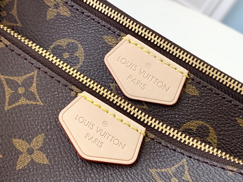 O Multi Pochette Accessoires é uma bolsa híbrida de corpo transversal com vários bolsos e compartimentos que reúne um Pochette Accessoires, um mini acesso de Pochette e uma bolsa redonda. Mortando a tela do monograma com um mini padrão de monograma nas laterais dos dois Pochettes, possui uma corrente removível de tons de ouro e uma pulseira de Jacquard Louis Vuitton ajustável para várias opções de transporte.