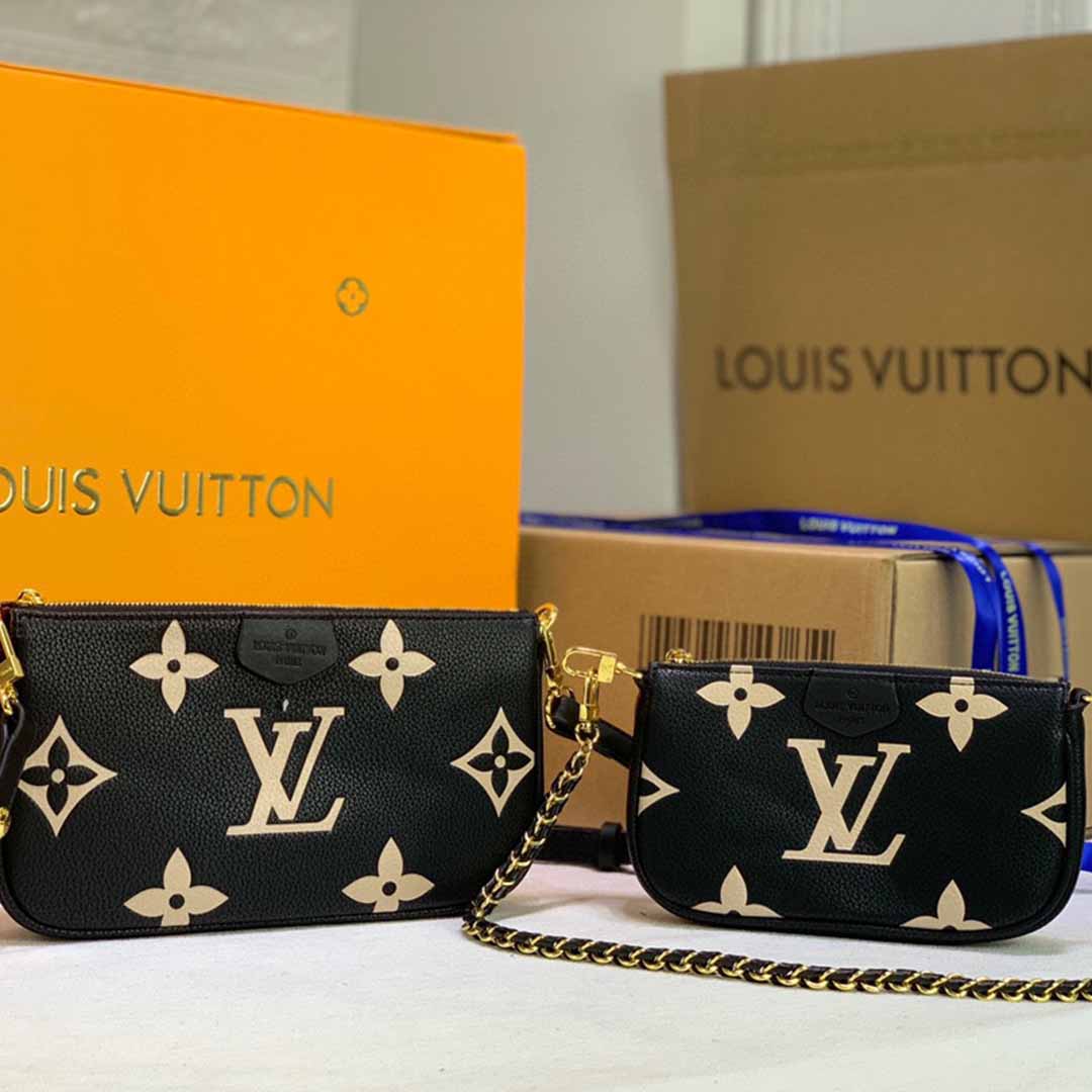 A bolsa cruzada de acessórios de Pochette Multi Pochette assume um aspecto impressionante em couro de monograma preto em relevo, em excesso, impressa com o motivo do monograma em uma cor creme. Do tamanho certo para carregar o essencial de uma mulher, esta bolsa de dois em um mantém as coisas organizadas com suas bolsas removíveis. É confortável usar graças à sua flexibilidade e peso leve.