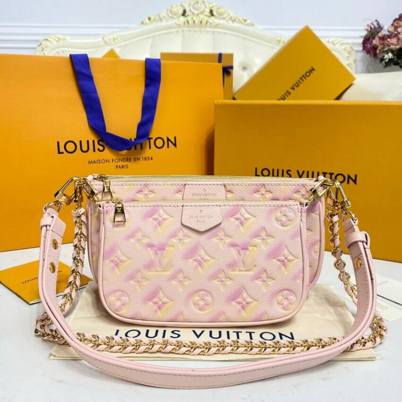 Com um aspecto iridescente cintilante, esta bolsa cruzada com vários pochette accessoires é feita de couro em relevo em um colorway alcançado por uma técnica de pulverização de três etapas. No tamanho certo para carregar o essencial de uma mulher, esta bolsa prática combina duas bolsas destacáveis. Possui uma corrente removível e uma pulseira destacável e ajustável.