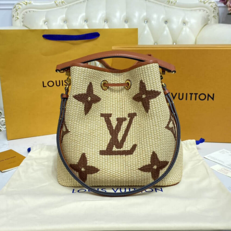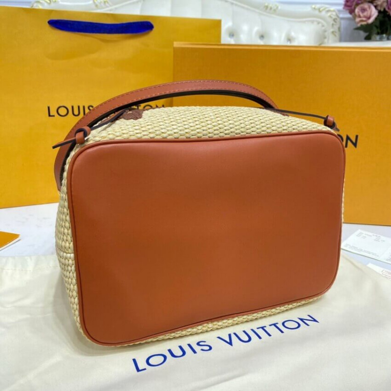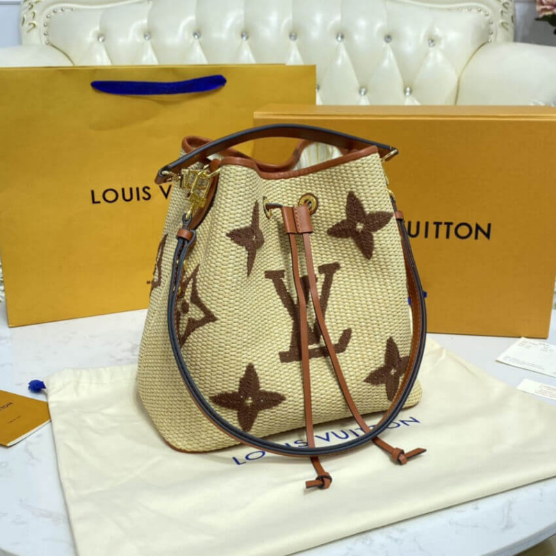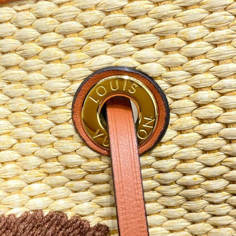O excepcional Savoir-Faire, de Louis Vuitton, traz uma sensação de praia criada ao padrão gigante do monograma nesta bolsa de caçamba neonoe mm. A base têxtil do tipo Raffia é combinada com uma cordão, alça removível e alça removível em couro para um toque de elegância de verão. O monograma Raffia é composto exclusivamente de algodão reciclado e viscose de origem sustentável. -LeaTheather Trim