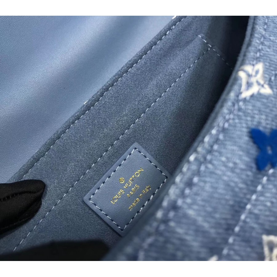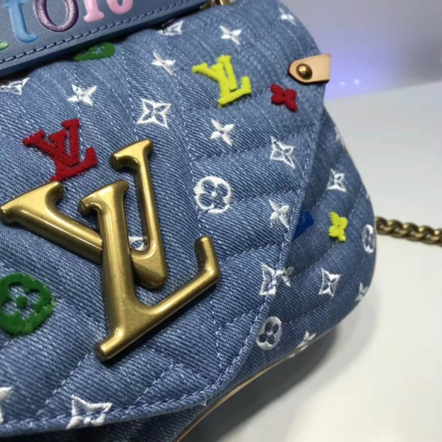 Para a primavera-verão de 2019, a bolsa de cadeia de novas ondas MM vem em jeans acolchoado com flores de monograma bordadas e LVs com tufos brilhantes e flores de monograma. O LV de cor ouro na frente complementa a alça removível com a assinatura vuitton multicolorida bordada. A alça de ombro de corrente dourada clássica completa a imagem. Com a assinatura bordada de Louis Vuitton
