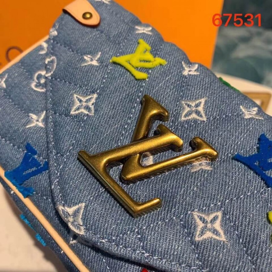 Esta edição especial da cadeia de novas ondas da Louis Vuitton Pochette faz parte da coleção sazonal de jeans LV. Criados a partir de jeans lavados, é acolchoado com o padrão de onda de assinatura da linha e embelezado com bordado colorido de monograma. Esta carteira é grande o suficiente para segurar um smartphone, enquanto um bolso com zíper protege objetos de valor. ] Hardware de cor dourada