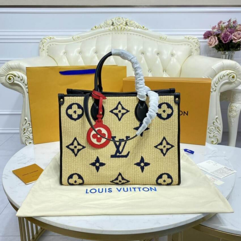 Perfeito para viajar ou um dia na praia, a sacola Onhego MM é feita de rafia monograma com alças de couro, alça de ombro e reforços. A rafia do monograma é composta de algodão reciclado e base de viscose de origem sustentável com um padrão gigante de monograma bordado. Esta bolsa possui um charme de bolsa removível em uma cor contrastante.