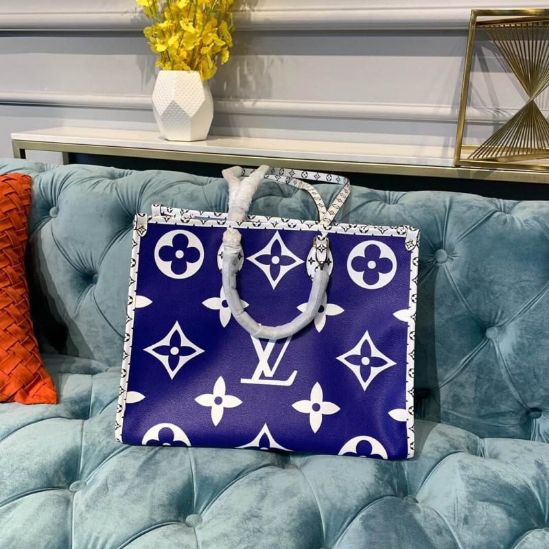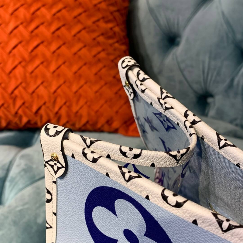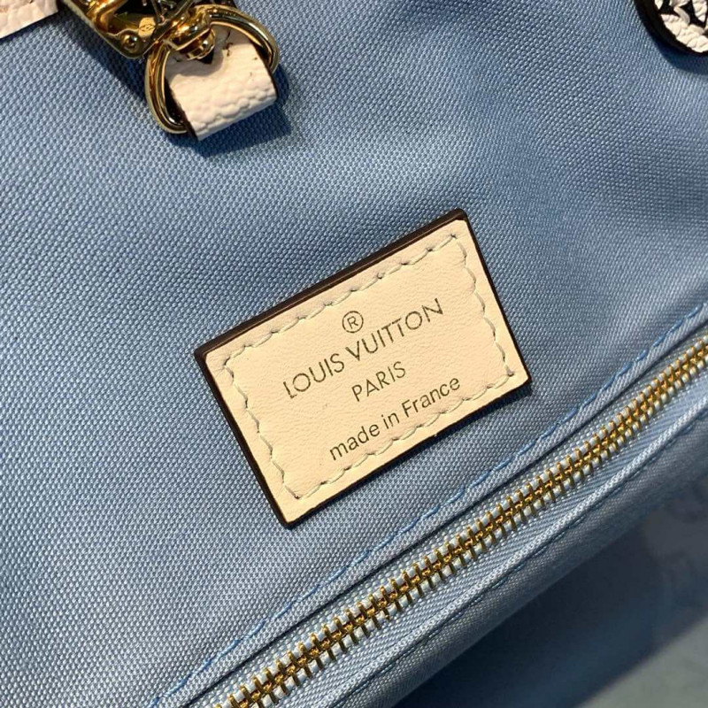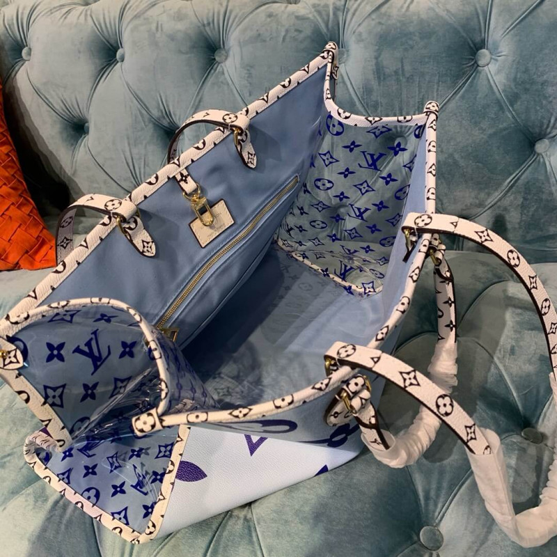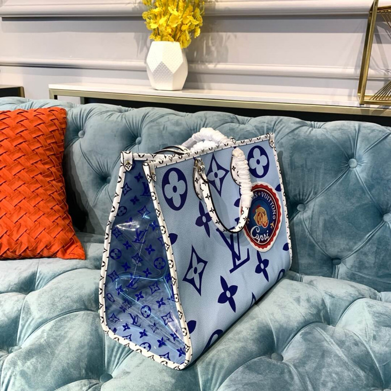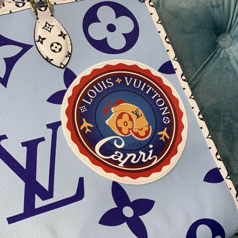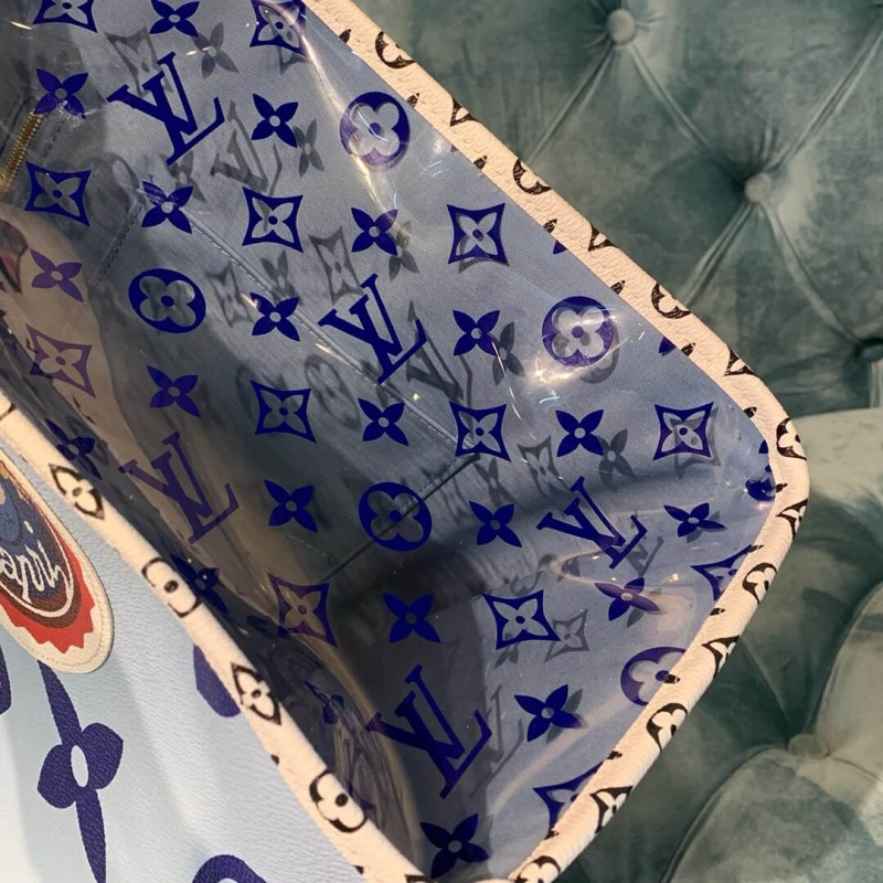 Esta coleção de primavera de edição limitada de 2019 é criada em tela revestida com monograma azul e multicolor. Possui hardware de latão, acabamento em lona revestido com monograma branco e preto, alças duplas de ombro plano, alças laminadas duplas, apliques multicoloridos de Portofino na parte frontal, cobalto e vinil do monograma azul. O topo se abre para um revestimento de lona azul claro com bolsos com zíper e remendo.