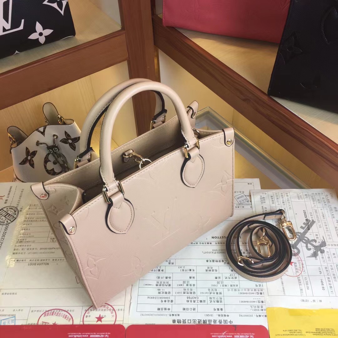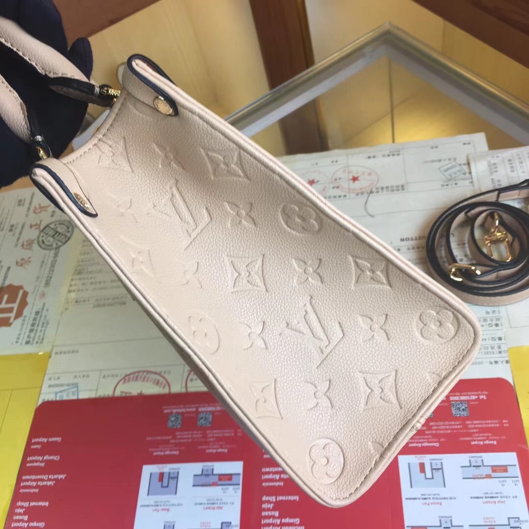 Inspirado no famoso SAC Plat de Louis Vuitton de 1968, a bolsa de Onhego PM é formada em couro Monogram Empreinte, em relevo com um sutil padrão de monograma gigante em relevo. Esta versão menor do OneTego original se encaixa no âmbito de itens essenciais, como um iPad Mini. As alças superiores articuladas e uma pulseira removível ajustável oferecem uma variedade de opções de transporte.