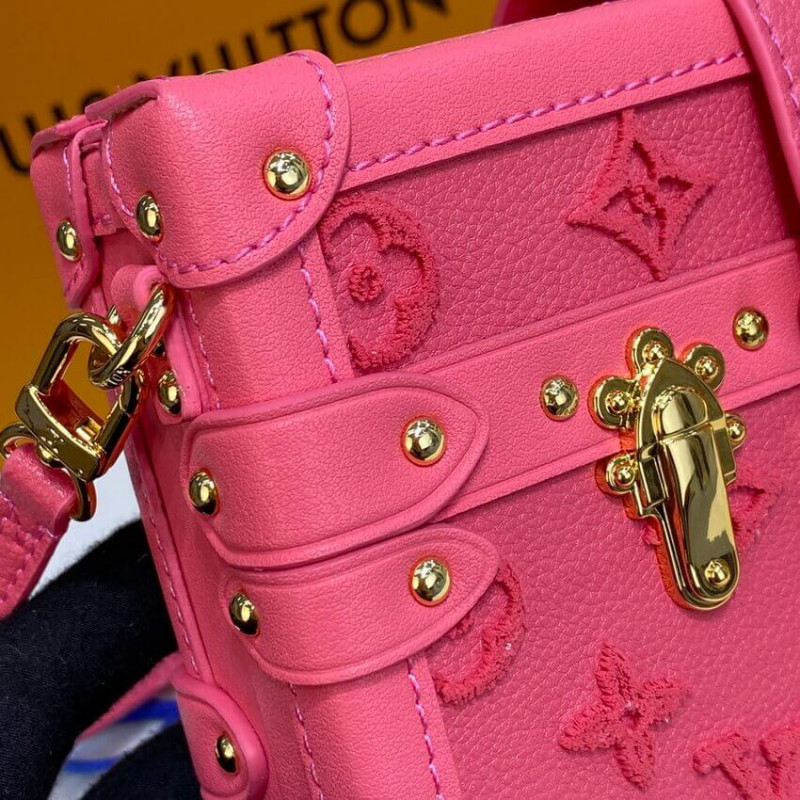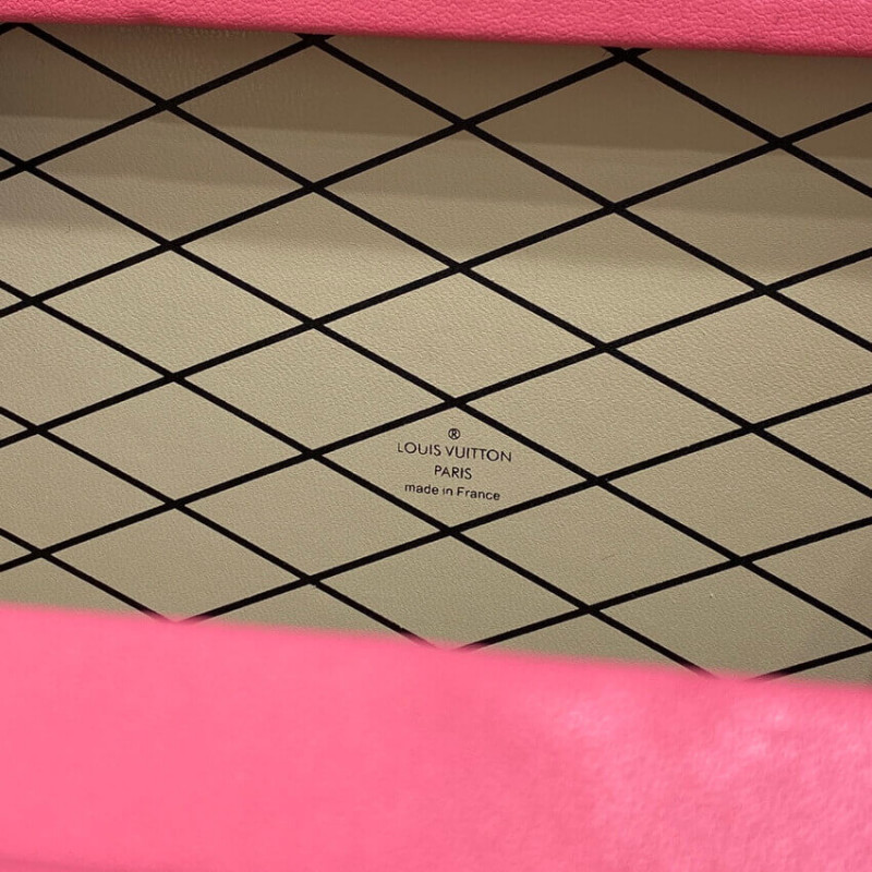 Uma explosão de rosa, esta pequena bolsa de malle é feita de couro de pele de bezerro com um acabamento em tom a tom. O artesanato da tufagem é impressionante: o padrão de monograma é delicadamente bordado no couro de granulação, com os fios cortados para criar uma sensação aveludada. Este monograma tufado traz uma lufada de modernidade a esse design icônico.