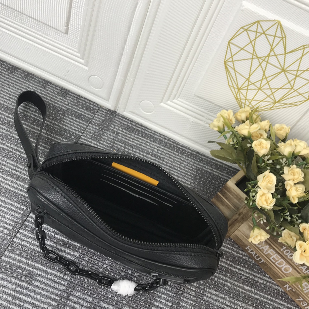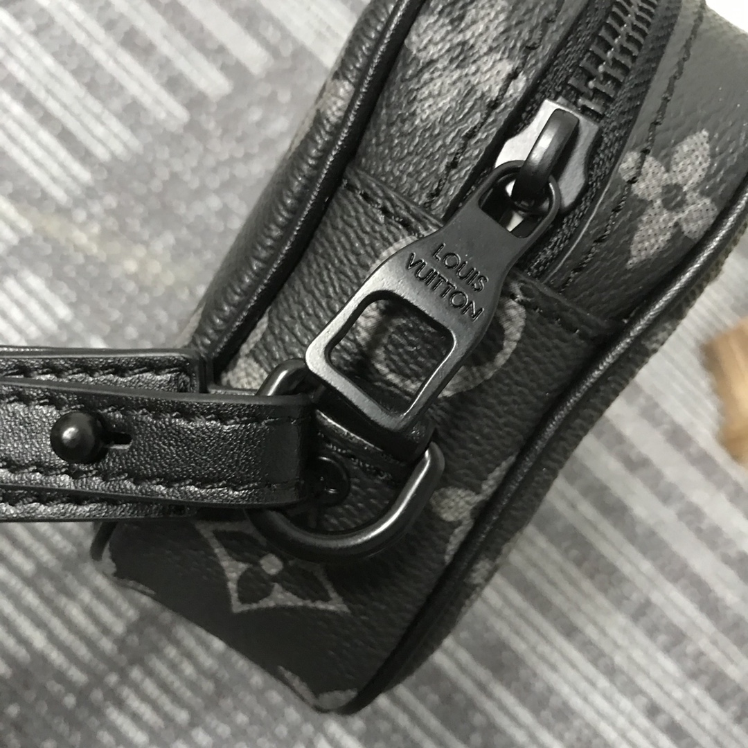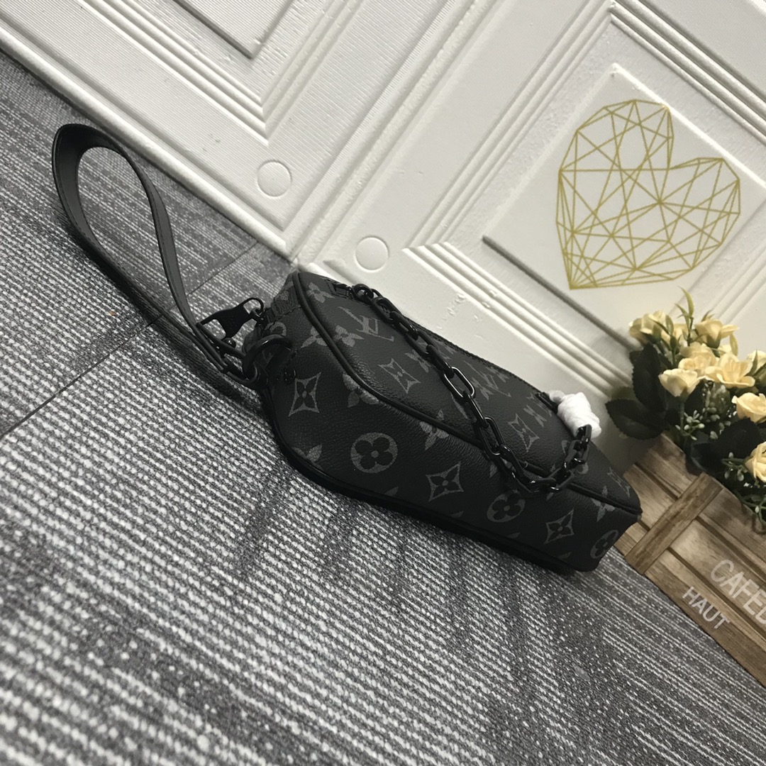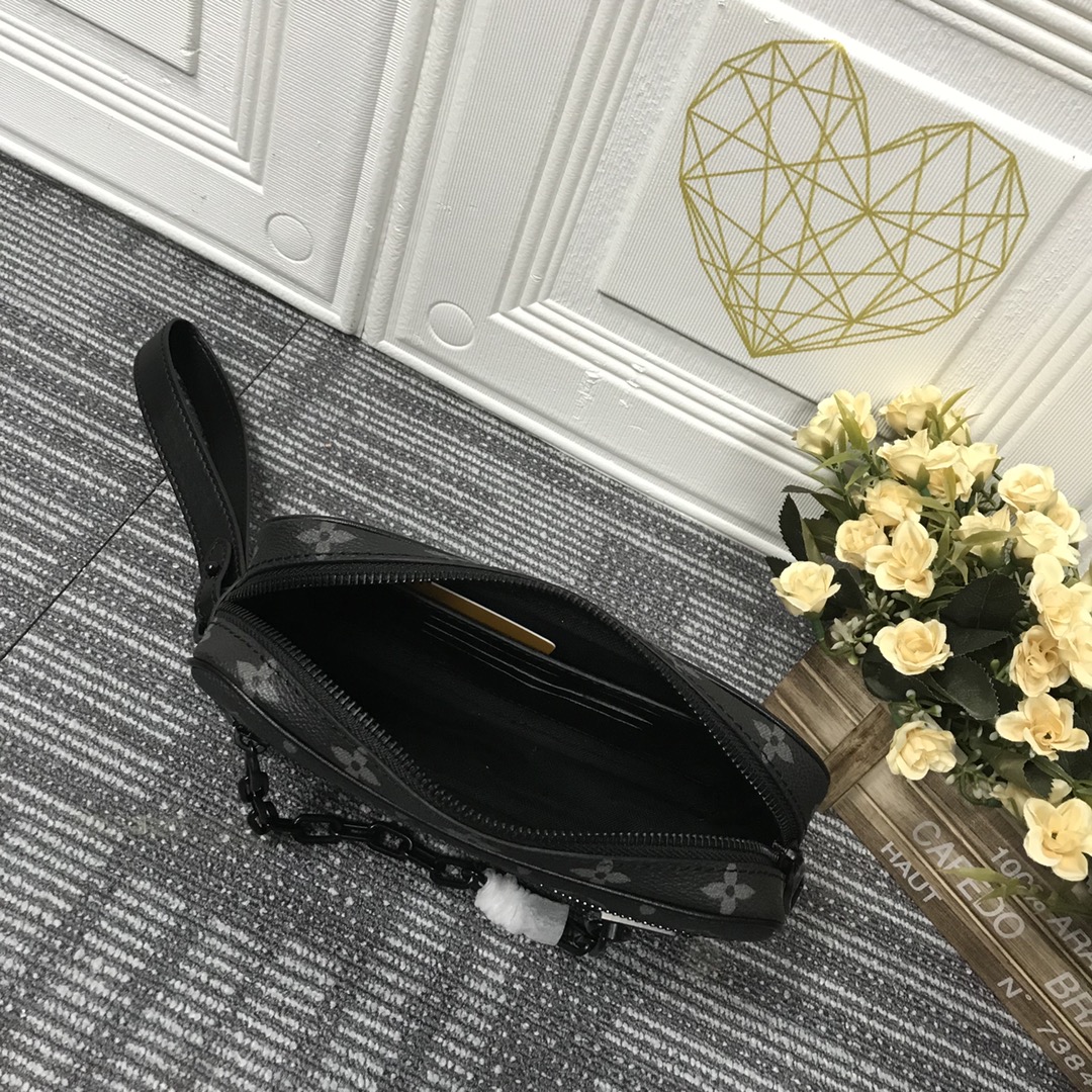 Virgil Abloh apresentou o Pochette Volga no programa Spring-Summer 2019. Feito de tela de eclipse de monograma com uma pequena corrente preta fosca presa ao bolso do zíper dianteiro, ele possui uma alça removível que permite que essa peça versátil seja usada como uma bolsa ou carteira pequena.