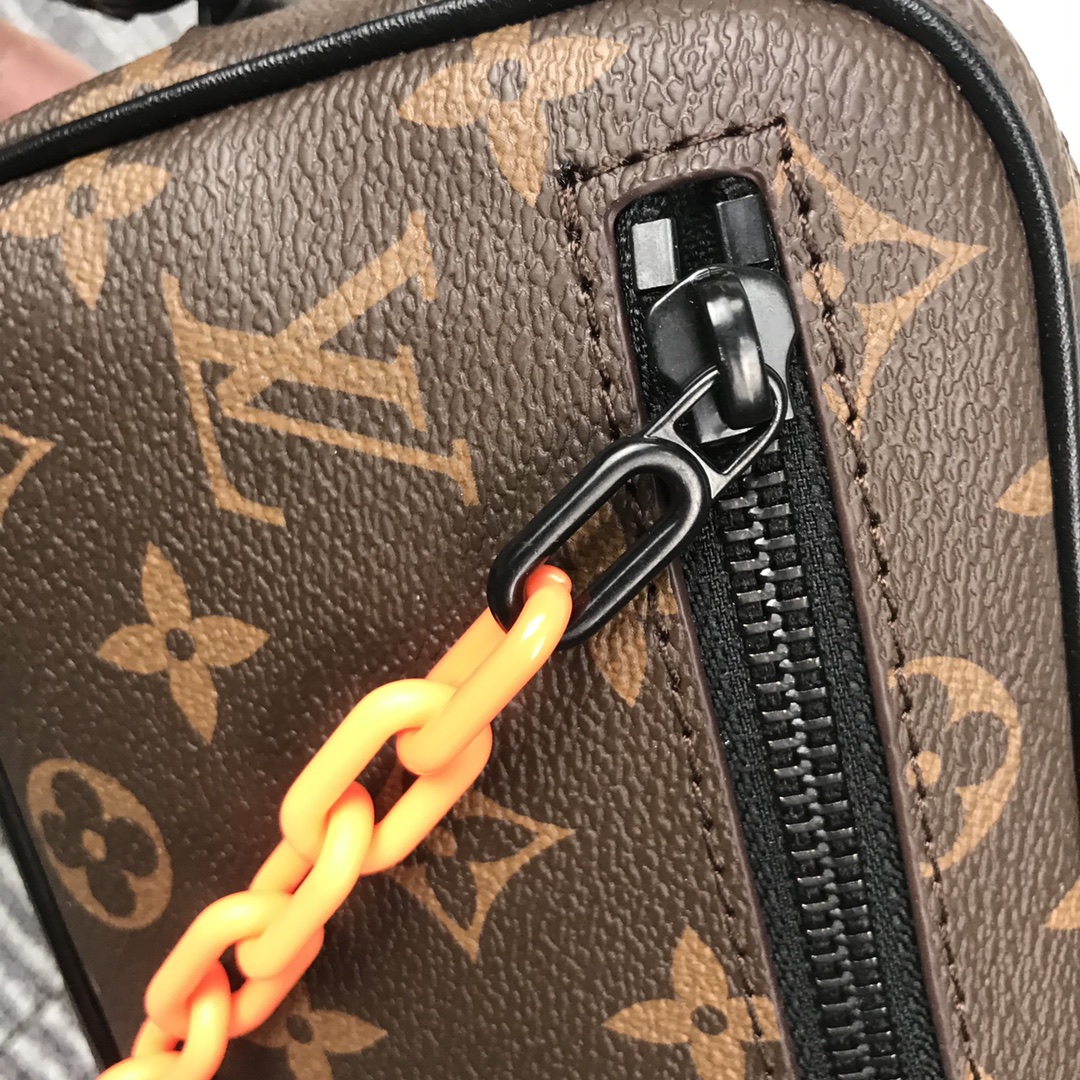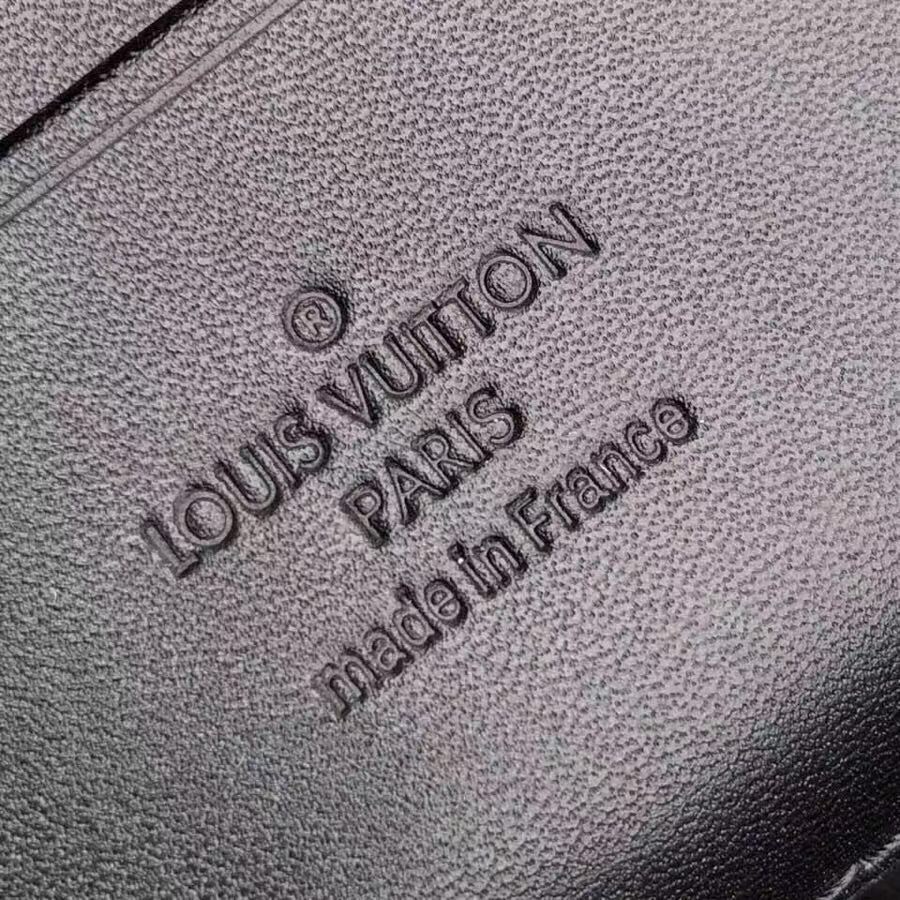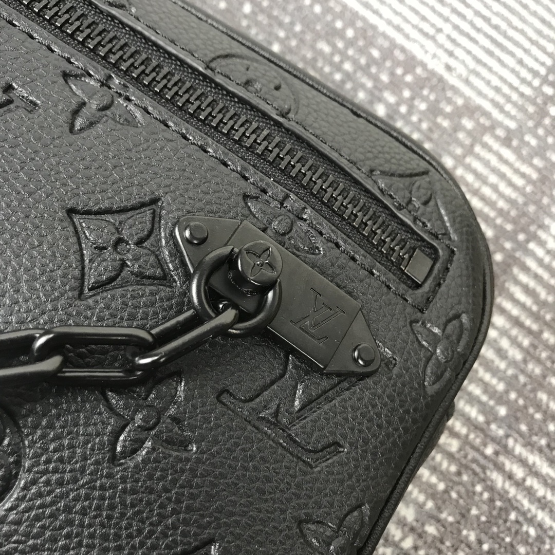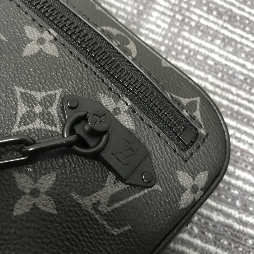 Virgil Abloh apresentou o Pochette Volga no programa Spring-Summer 2019. Feito de tela de eclipse de monograma com uma pequena corrente preta fosca presa ao bolso do zíper dianteiro, ele possui uma alça removível que permite que essa peça versátil seja usada como uma bolsa ou carteira pequena.