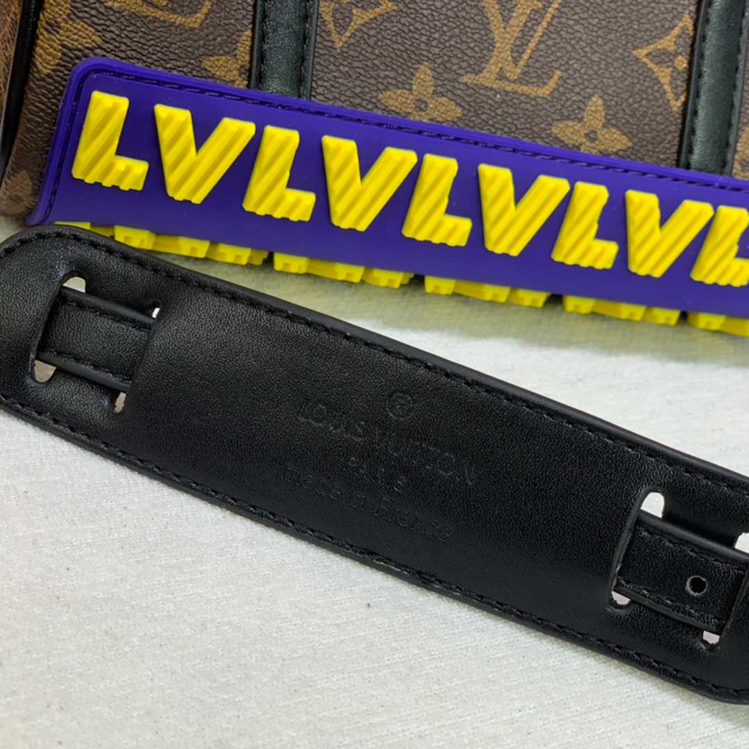 A aparência de borracha do VE dá ao Keepall XS um impulso ousado de cor e estilo para o outono 2021. A tela do monograma é adornada e protegida por um aplique de látex na parte inferior, mostrando as iniciais da casa em amarelo e roxo atraentes. Com sua alça dupla e alça ajustável, é uma bolsa prática e fácil de carregar que faz uma forte declaração de assinatura.