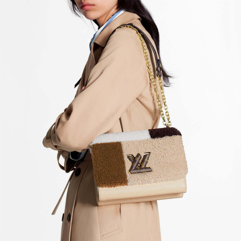 O tosquinho fofo em tons de bege e marrom dá à icônica bolsa mm twist mm uma sensação aconchegante para a edição especial do LV Teddy. Demonstrando o artesanato de luas de couro da Louis Vuitton, uma técnica elaborada de Intarsia é usada para criar uma colcha de retalhos de cores diferentes. A trava de torção LV da bolsa é coberta em tela de monograma.