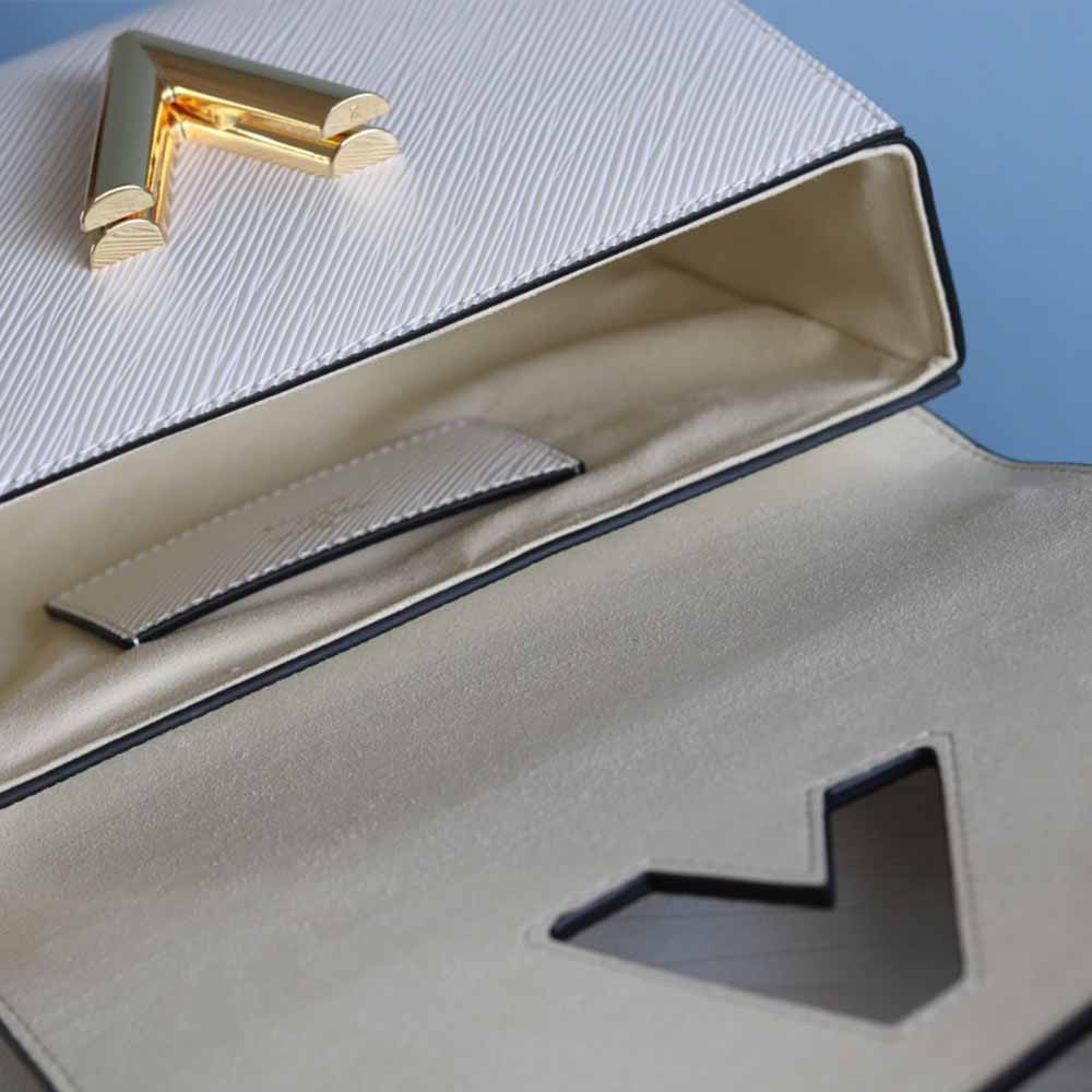 A bolsa clássica MM Twist MM em couro EPI branco de granulação assume um novo apelo, graças à sua pulseira Jacquard removível com “Louis Vuitton”, tecido no tecido e um charme de couro LV. A pulseira ajustável, que oferece transporte de ombro ou corpo cruzado, vem em um colorway de caramelo tom-a-tone.