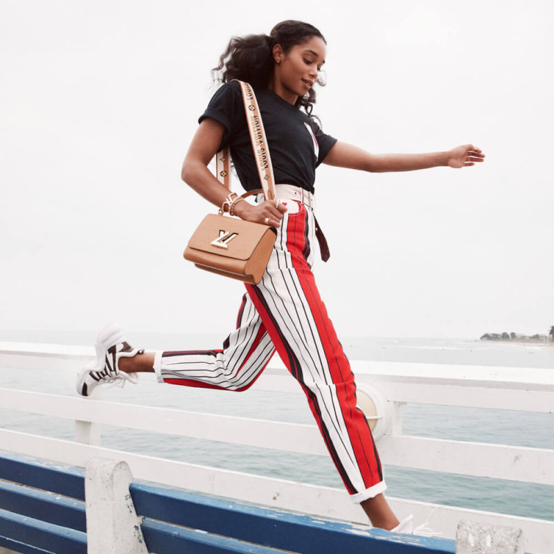As linhas icônicas da bolsa Twist MM são renovadas com uma ampla cinta de Jacquard. Bordados com Louis Vuitton de um lado e o monograma floresce do outro, a pulseira removível permite o transporte de corpo cruzado curto. Esta reviravolta também pode ser transportada à mão ou usada no cotovelo, graças a uma alça de couro removível. e Jacquard Strap