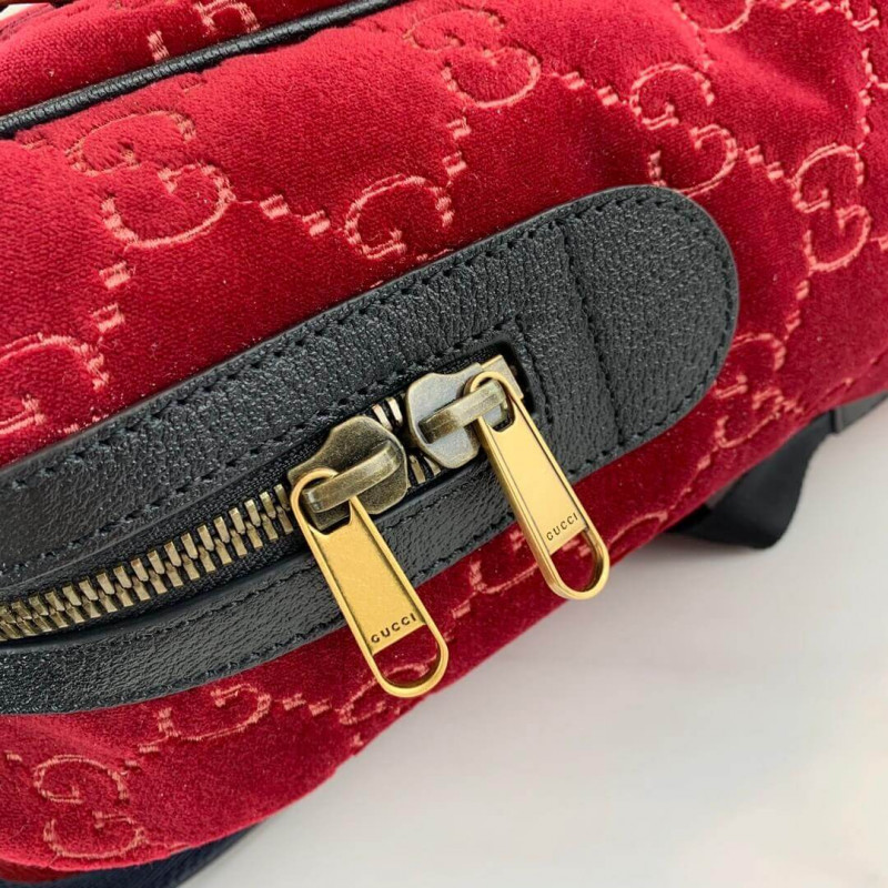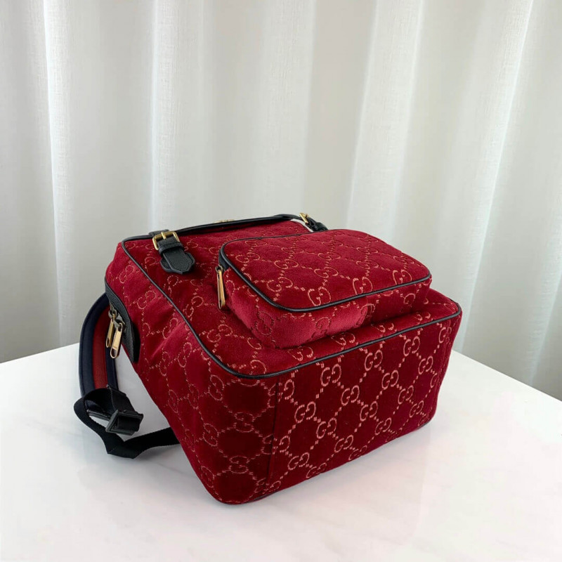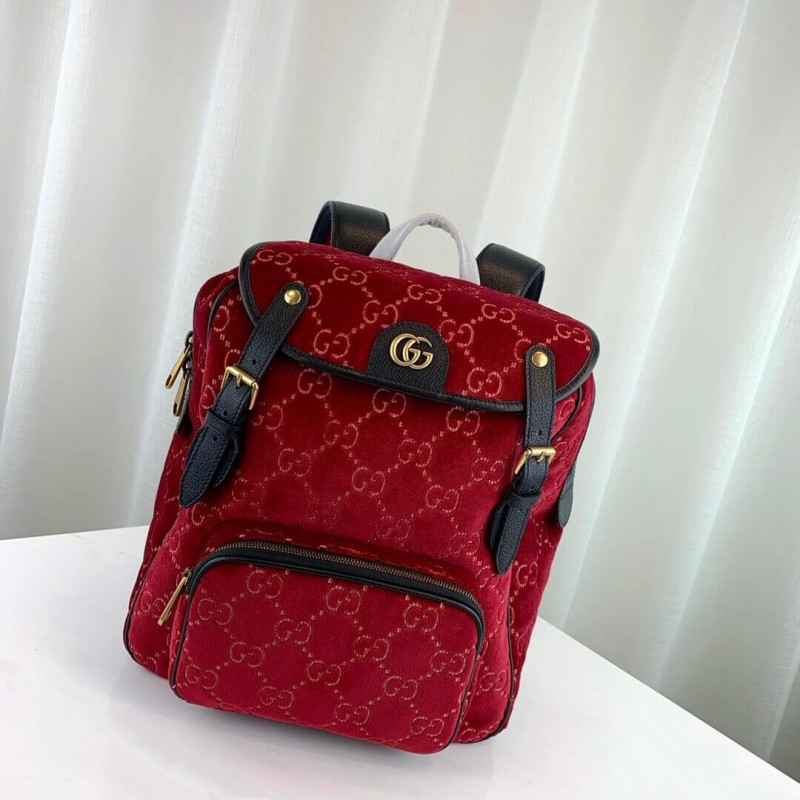A mochila é apresentada em uma silhueta menor para 2019 antes do outono, em veludo GG azul escuro com acabamentos de couro. O motivo distinto GG é incorporado ao tecido de veludo macio, contrastado por fivelas de couro preto, acabamentos e hardware em tons de ouro. As tiras de couro acolchoadas apresentam um detalhe escondido da casa, com a faixa azul e vermelha no interior. Tabela azul e vermelha no interior das tiras