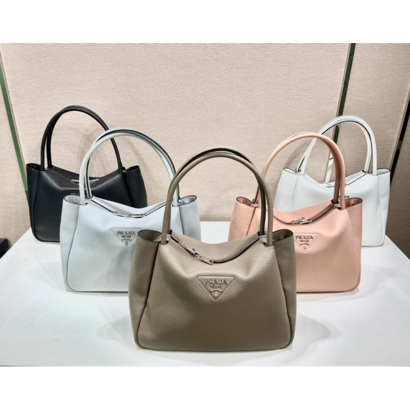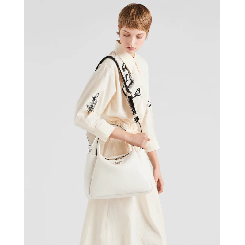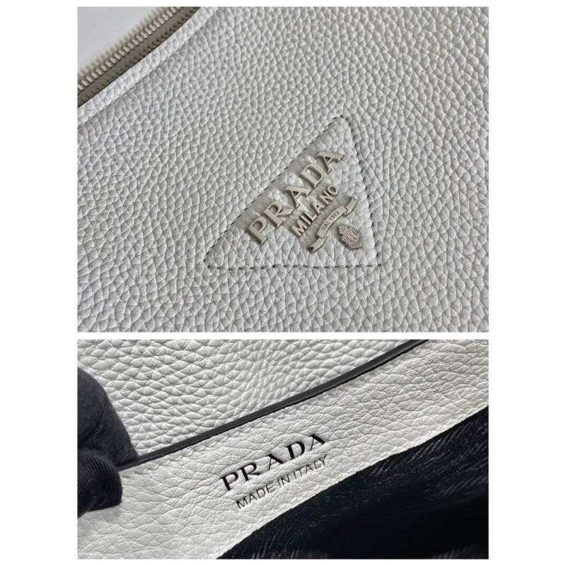 A costura reversa enfatiza a silhueta macia e arredondada desta bolsa com uma alça de ombro de tecido destacável versátil com o logotipo bordado em uma cor contrastante. O acessório é decorado com a nova interpretação do triângulo formada por costura com o logotipo de letras de metal da Prada brilhando em seu centro.