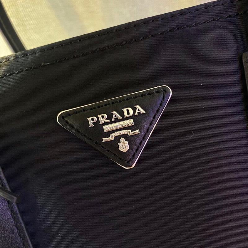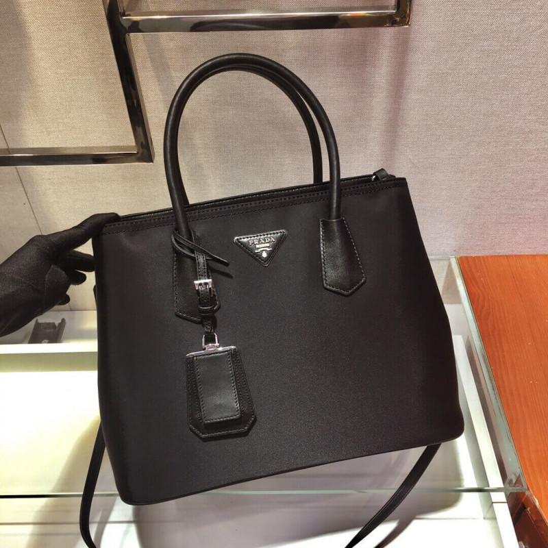 Esta inconfundível Prada Double Bag é uma nova versão que combina dois materiais icônicos da marca: Leather Saffiano e Nylon. O acessório com fechamento instantâneo nas laterais tem alças de couro e uma alça destacável. Ele tem uma etiqueta de nome de couro com acabamento em metal e é decorada com o logotipo de letras de metal.