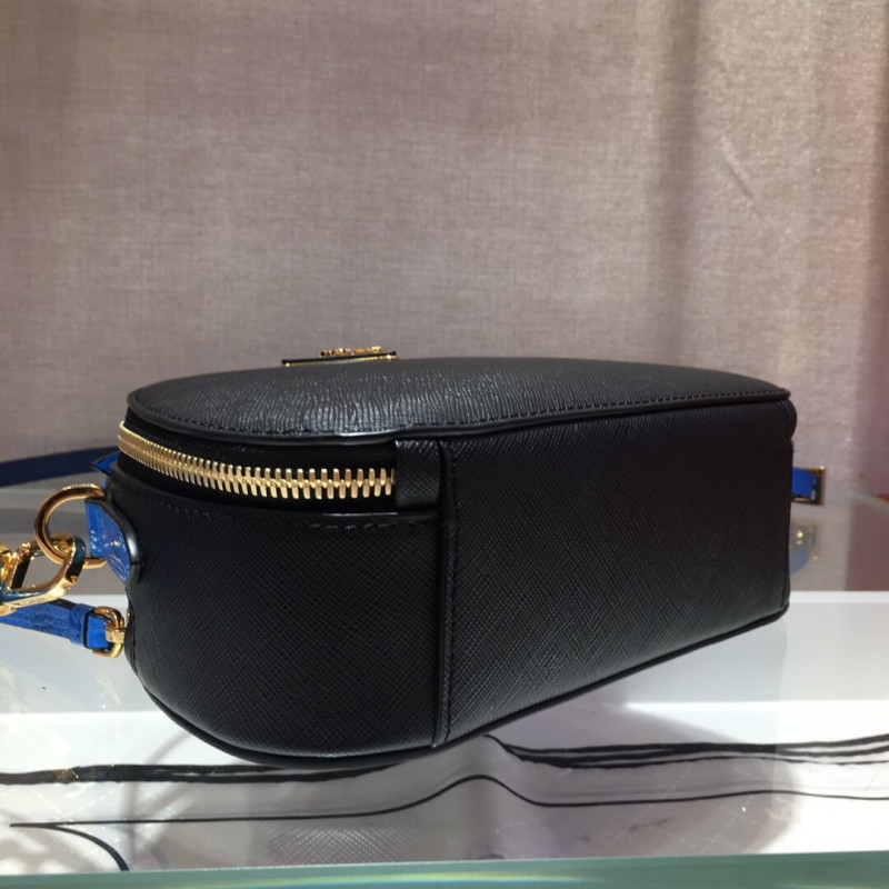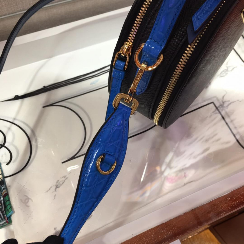 O design da nova bolsa Prada Odette feita de couro açafano, transportada à mão ou usada como uma bolsa de ombro, é inspirada em caixas de câmera usadas por fotógrafos e repórteres. As linhas arredondadas e minimalistas da bolsa são aprimoradas por acabamento em couro fino de crocodilo.
