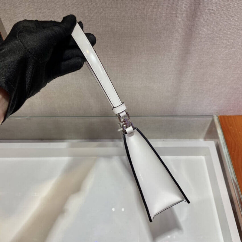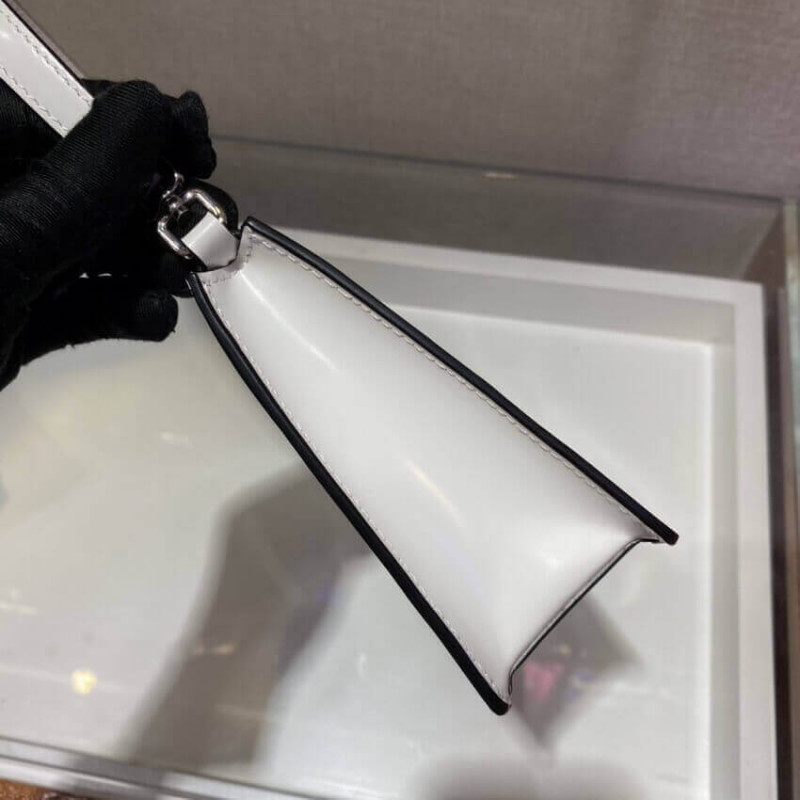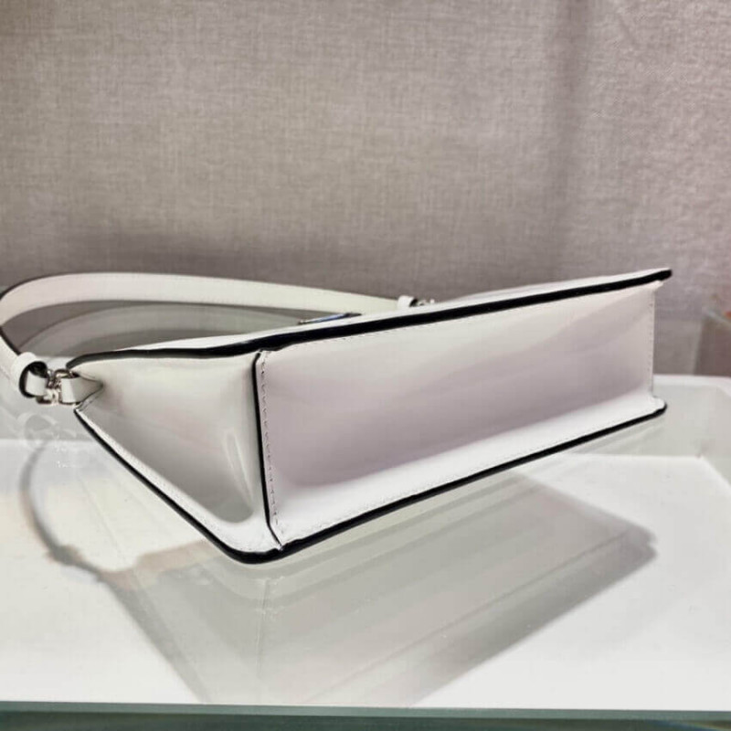 Definida por um design estruturado, esta mini bolsa vem em Saffiano, um icônico material da Prada: couro da bezerro da mais alta qualidade, definido por um padrão de hachura e acabamento encerado. O logotipo do triângulo de metal esmaltado adorna o acessório.