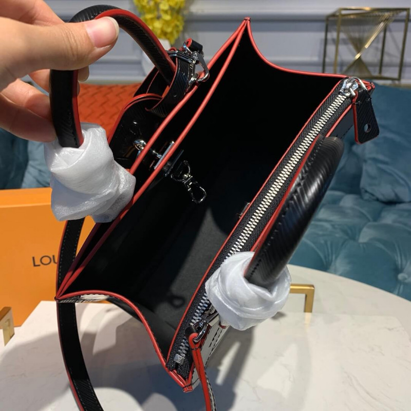 Inspirado na icônica bagagem da Vuitton de 1901, esta impressionante bolsa de declaração é dotada de efeito contrastado da moda. Esta animação exclusiva faz do vapor da cidade uma obra de arte única. e cadeado facetado