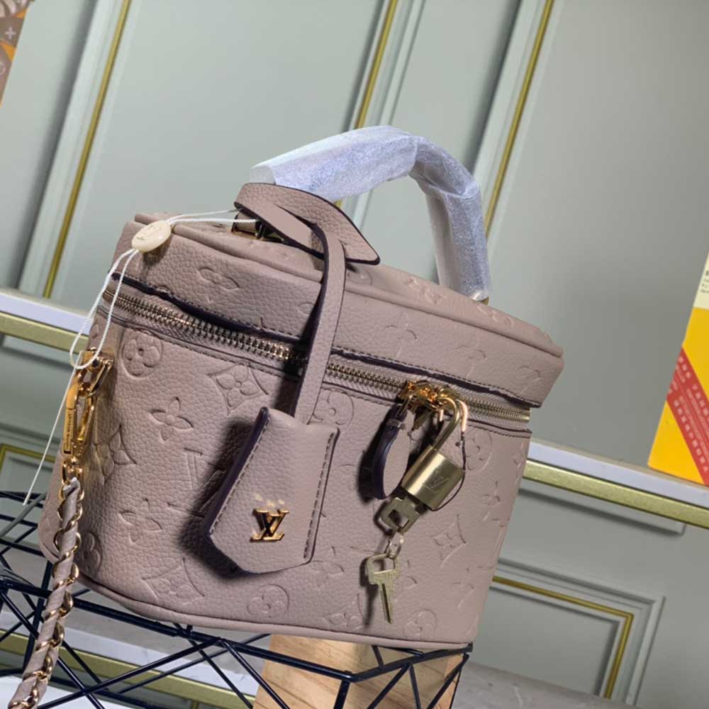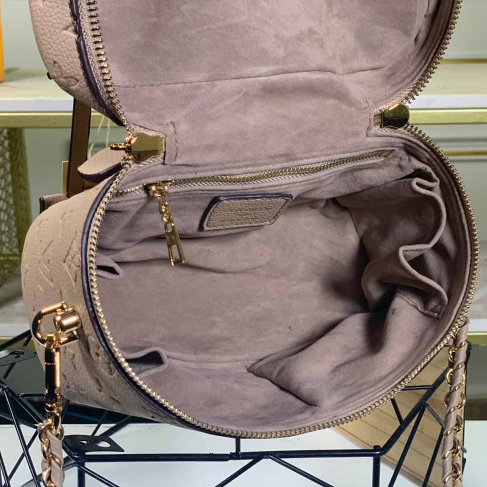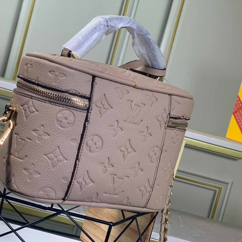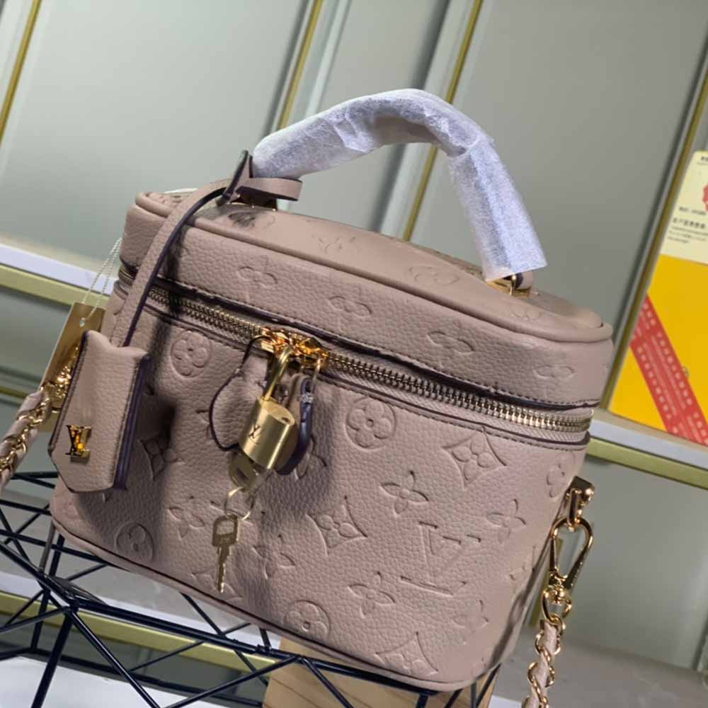 Inspirado na vaidade do monograma Nice, a bolsa PM da vaidade em couro de Monogram Empreinte é uma bolsa moda com uma forma distinta. É feito de couro granulado, em relevo com o motivo gigante do monograma. Seus puxadores de zíper da borla, alça top -top e tira removível o tornam versátil e surpreendentemente elegante.